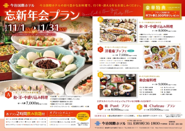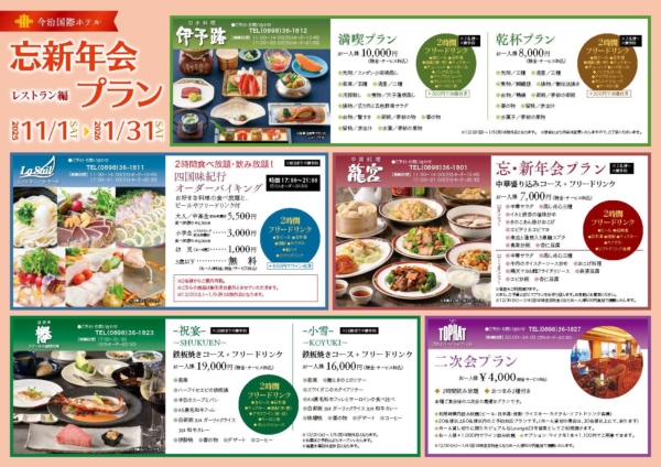 新着情報 イベント 【11月~1月】忘新年会プラン 今治国際ホテル 忘新年会プラン 2025 PDFはこちらから 開催日 2025年 11月1日(土)~2026年1月31日(土) ご予約・お問い合わせ 0898-36-1800 (予約課直通)