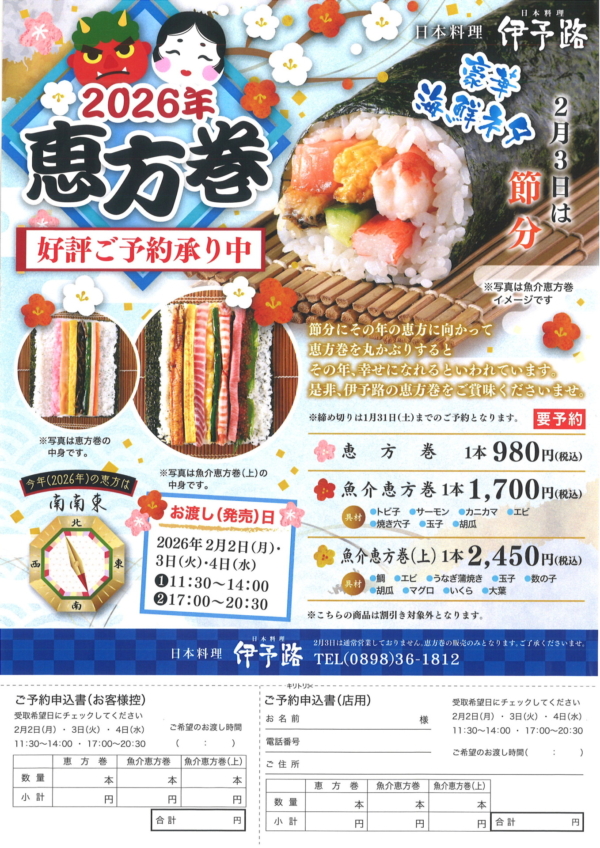 ※2月3日の『伊予路』の通常営業はございません。恵方巻の販売のみとなります。